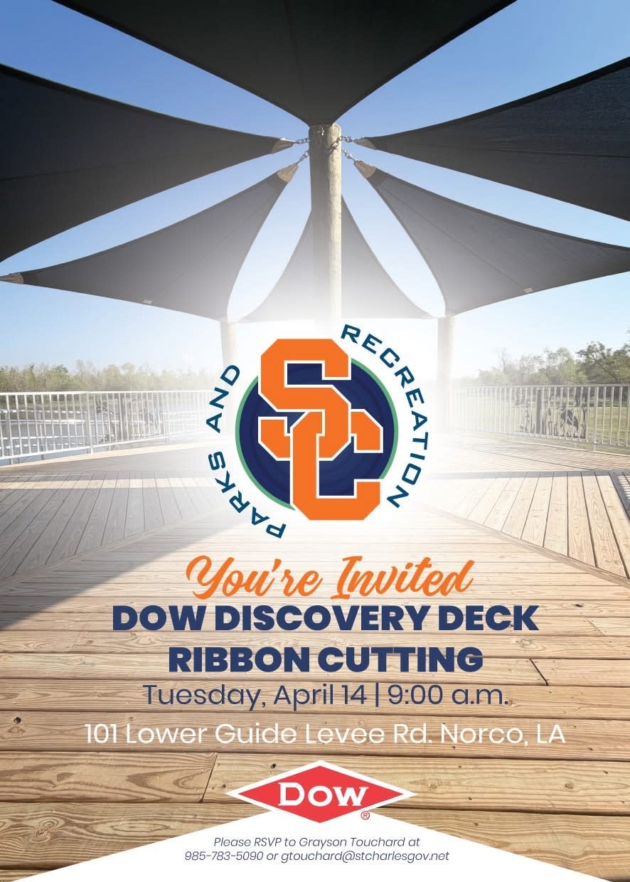 We’re excited to invite you to the ribbon cutting of our new outdoor classroom on April 14th at 9:00 a.m. at the Spillway in Norco. This new space, officially named the “Dow Discovery Deck,” was made possible through the support of our partners at Dow - St. Charles Operations.